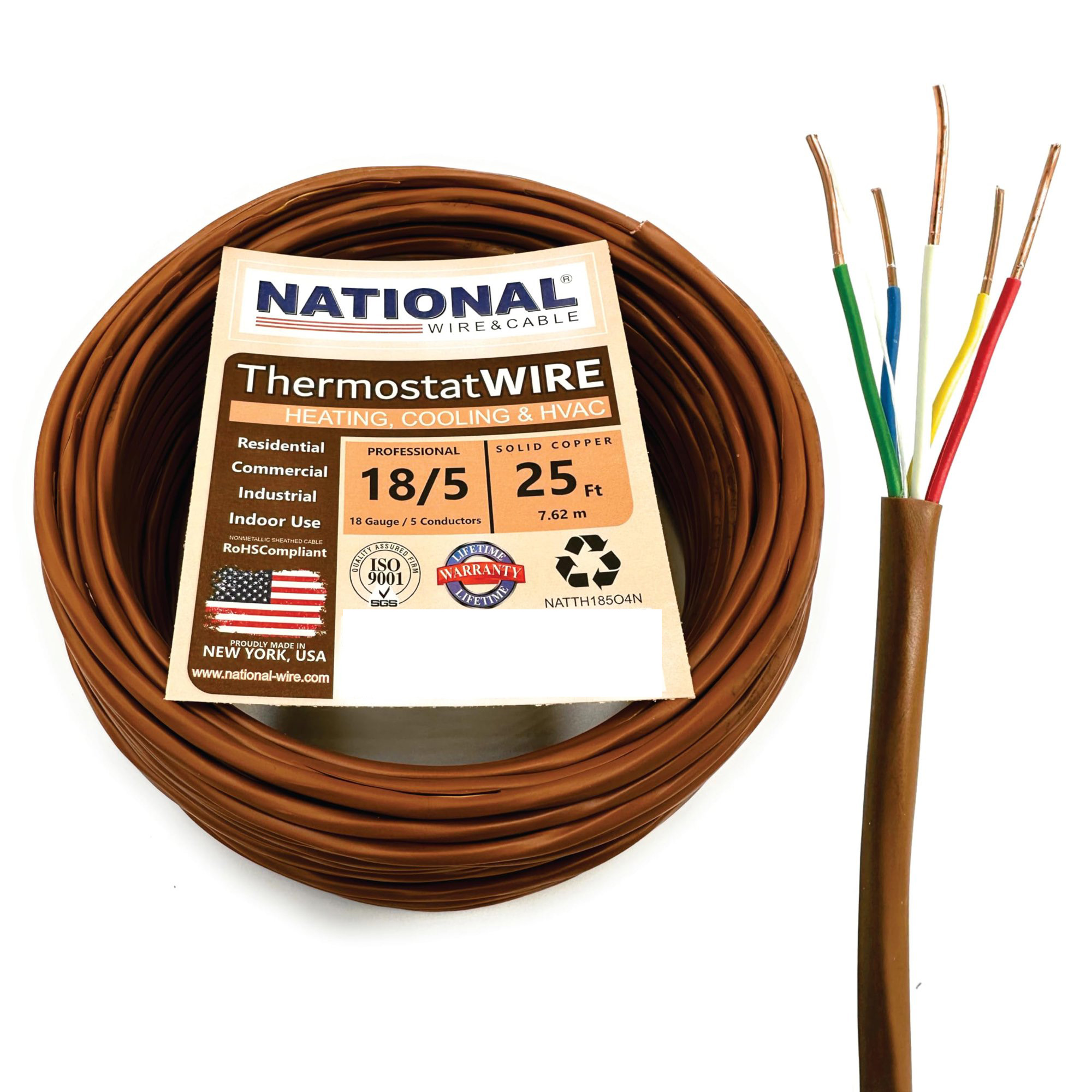 National Wire 18AWG/5C-25 5 Conductor 18 Gauge Solid Copper Thermostat Cable. This item is a 25 ft length of thermostat wire. The wire consists of 5 strands of coated, color-coded copper wire to connect a thermostat to heating, ventilation and air conditioning systems. The five wires include power, heat, cooling, fan and common all harnessed in a single jacket.