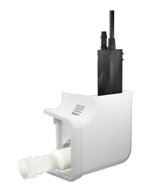 The pump features an integrated reservoir and external optical level sensor for reliable operation. It also includes a flexible, posable hose with filter and adapter, allowing direct connection to the condensate tray. The adjustable hose can serve as a reservoir replacement, making installation both versatile and quick.