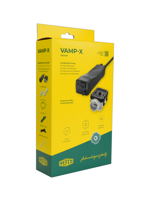 The VAMP-X Condensate Pump is a split design condensate removal solution. It features a pump as well as an external sensor, both of which can be positioned where you need. The VAMP-X is ideal for installations where the pump cannot be placed at the point where the condensate collects. It is exceptionally quiet, as well as quick and easy to install. It includes an integrated reservoir and external optical level sensor. The flexible, adjustable hose serves as a reservoir replacement (with filter and adapter) for direct connection to the condensate tray.