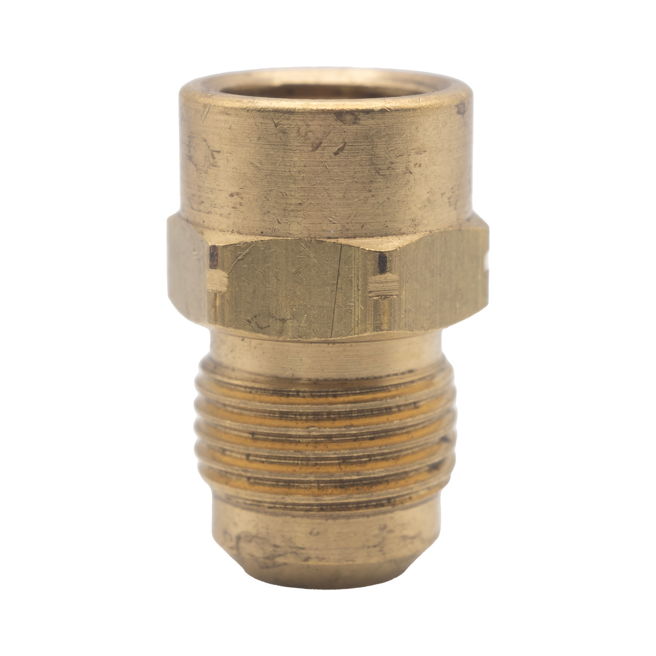 3/4" female to 3/8" male S.A.E. flare reducer. Both sides are flared. Brass adapters can be used across many industries where soldering is not a possibility. They provide a strong connection and are used with liquid and gas distribution passing through piping including line sets used with mini splits and air conditioner units. Flare reducers are used to safely join two differently sized flared connections together. These flare fittings are constructed of brass for the safe use with natural gas and are assembled with short forged nuts.