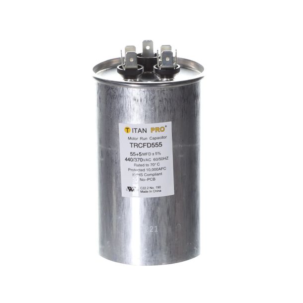 The Titan Pro TRCFD555 Capacitor is a dual rated motor run capacitor. A capacitor is a component that stores electrical energy for you motor to operate. The capacitance or storage is reported in microfarads (uF or mFd).