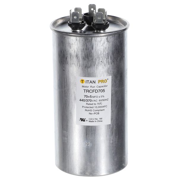 The Titan Pro TRCFD705 Capacitor is a dual rated motor run capacitor. A capacitor is a component that stores electrical energy for you motor to operate. The capacitance or storage is reported in microfarads (uF or mFd).